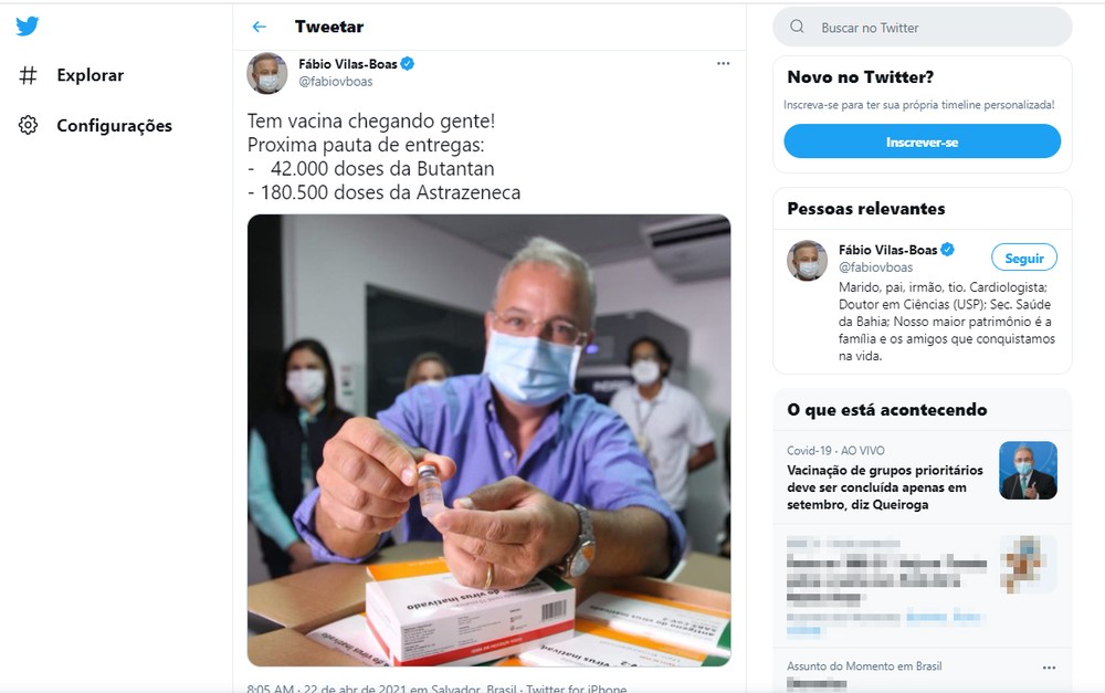 Através das redes sociais, o secretário de Saúde, Fábio Vilas-Boas, celebrou a chegada da vacina e divulgou a quantidade de doses por tipo.