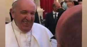 “Santo Padre, reze por nós, brasileiros”, disse o padre Souto Victor. Francisco respondeu brincando: “Vocês não têm salvação. É muita cachaça e pouca oração”.