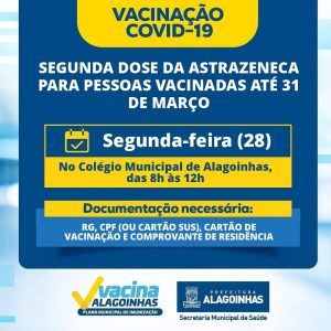 Nesta segunda-feira(28), continua a vacinação contra covid-19 em Alagoinhas, com a dose de reforço para as pessoas tomou a AstraZeneca até o dia 31 de março e para as pessoas que tomou a Coronavac até o dia 21 de maio.