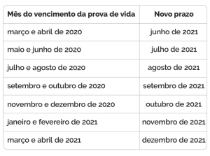 A obrigação também vale para os anistiados políticos civis. O calendário será escalonado de acordo com o mês de nascimento. Quem nasceu de janeiro a julho tem até 30 de setembro para fazer a prova de vida de 2020 e de 2021. Quem nasceu nos meses seguintes obedece a um cronograma distinto para a prova de vida de cada ano, conforme o calendário abaixo.
