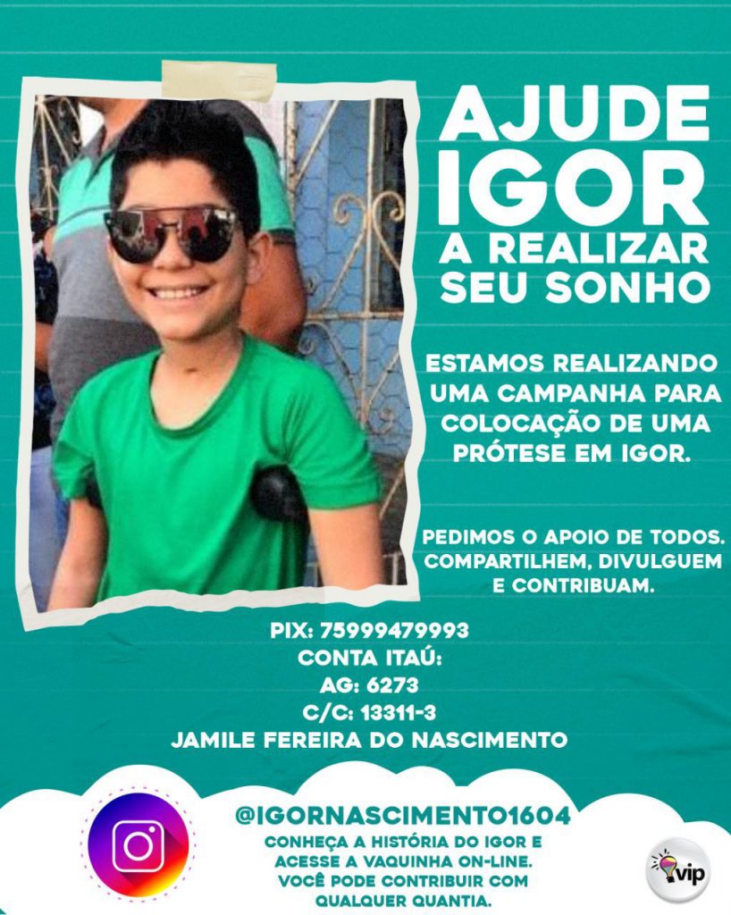 “Pessoal mais uma vez venho aqui pedi a vocês que não deixem de me ajudar. Eu quero muito realizar o meu sonho, poder correr com as minhas duas pernas, poder continuar jogando bola da mesma maneira que os meus amigos. Me ajude a ser ainda mais feliz…” Disse Igor