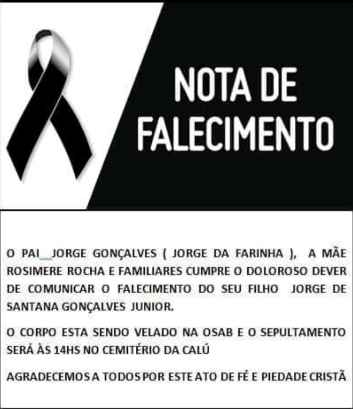 O prefeito Joaquim Neto emitiu uma nota de pesar, Com imensa tristeza recebi a notícia do falecimento do jovem Jorge Júnior, filho do meu amigo e secretário de governo Jorge da Farinha. Nesse momento, peço a Deus que em sua infinita misericórdia conforte o coração dos familiares e amigos.