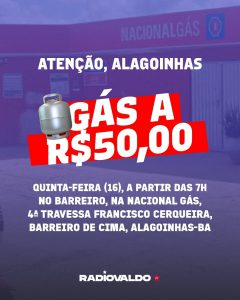 Nesta quinta-feira (16), acontece mais uma ação a preço justo em Alagoinhas. A partir das 7horas da manhã na Nacional Gás, localizada na 4ªTravessa Francisco Cerqueira no Bairro Barreiro.