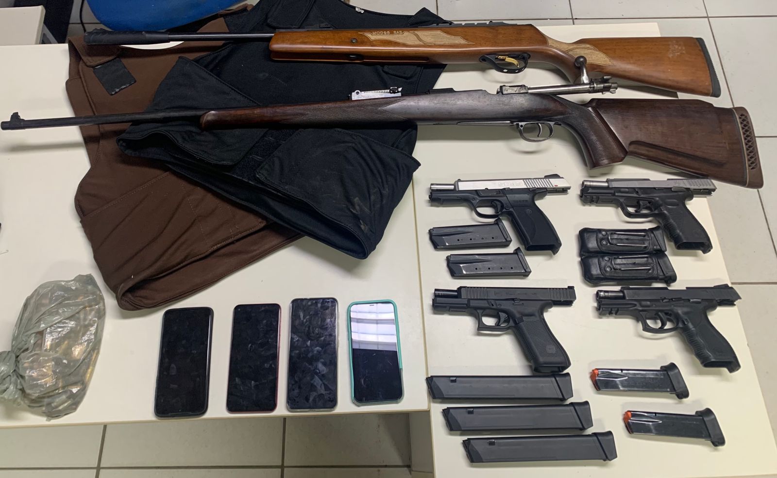 Dentro do carro foram encontrados um fuzil calibre 7,62, uma espingarda, quatro pistolas calibres 40, 45 e 9mm, carregadores, coletes balísticos e farta munição de diversos calibres.