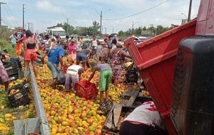 Caminhão carregado com manga tomba na BR-324; carga foi saqueada