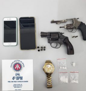 Na noite desta terça-feira (23), guarnições 2° CIA PM e da Companhia de Emprego Tático e Operacional (CETO) capturaram um homem e uma adolescente, logo após tentativa de roubo na Rua 21 de abril, e com eles apreenderam dois revólveres Rossi, calibres 32 e 22, e quatro porções de substância análoga à cocaína. Os conduzidos são suspeitos da prática de assaltos na região de Buracica e Pindobal.