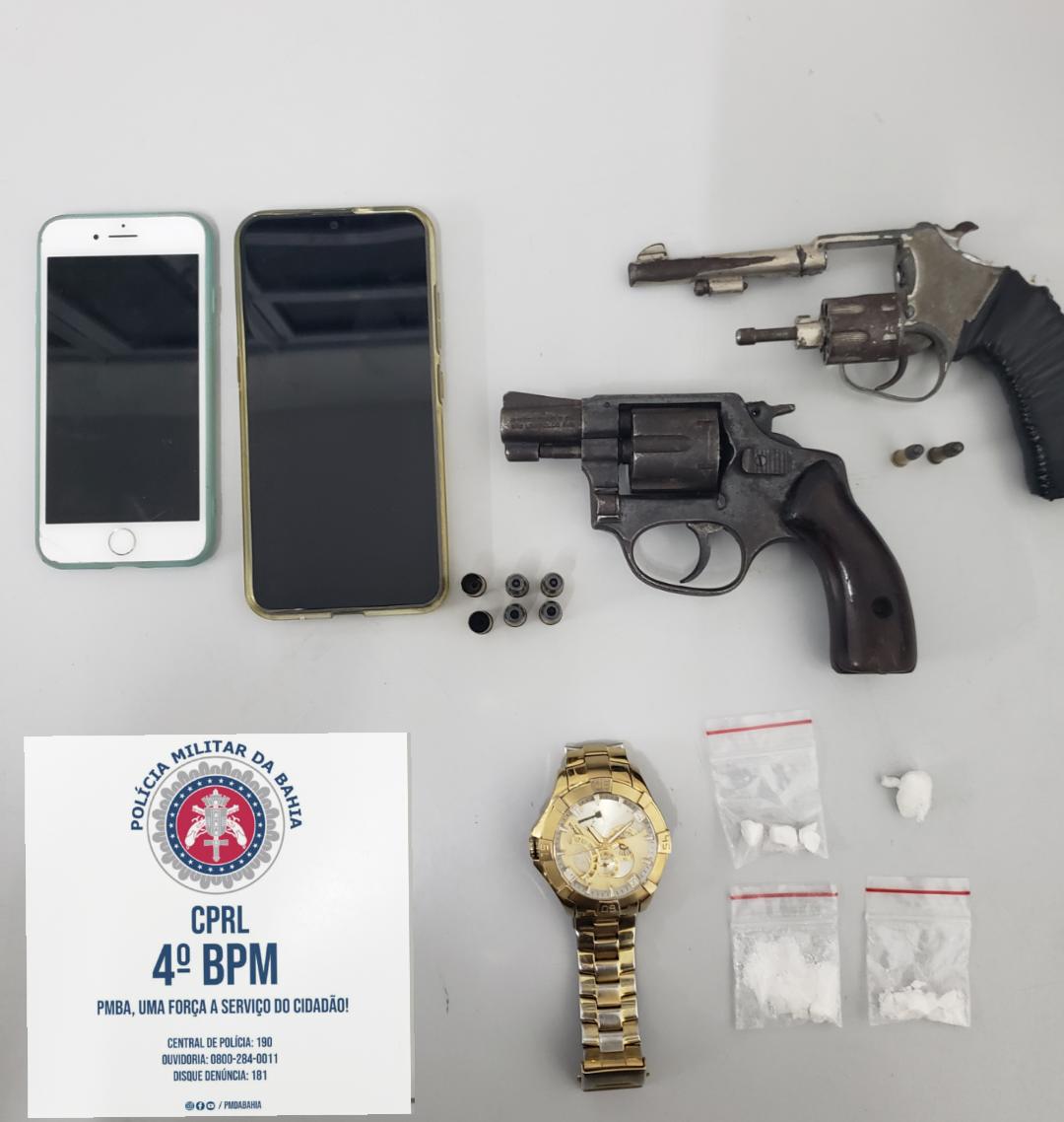 Policiais do Quarto Batalhão prendem dois homens, após tentativa de roubo, e apreendem duas armas de fogo e drogas, em Alagoinhas