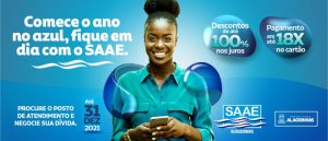 “Comece o ano no azul, fique em dia com o SAAE”, esse é o slogan da campanha de negociação de débitos 2021 do Serviço Autônomo de Água e Esgoto de Alagoinhas. O objetivo é motivar o usuário a regularizar suas pendências a partir das condições especiais de fim de ano, que incluem o desconto de até 100% nos juros de multa e mora e o parcelamento em até 18 vezes no cartão de crédito.
