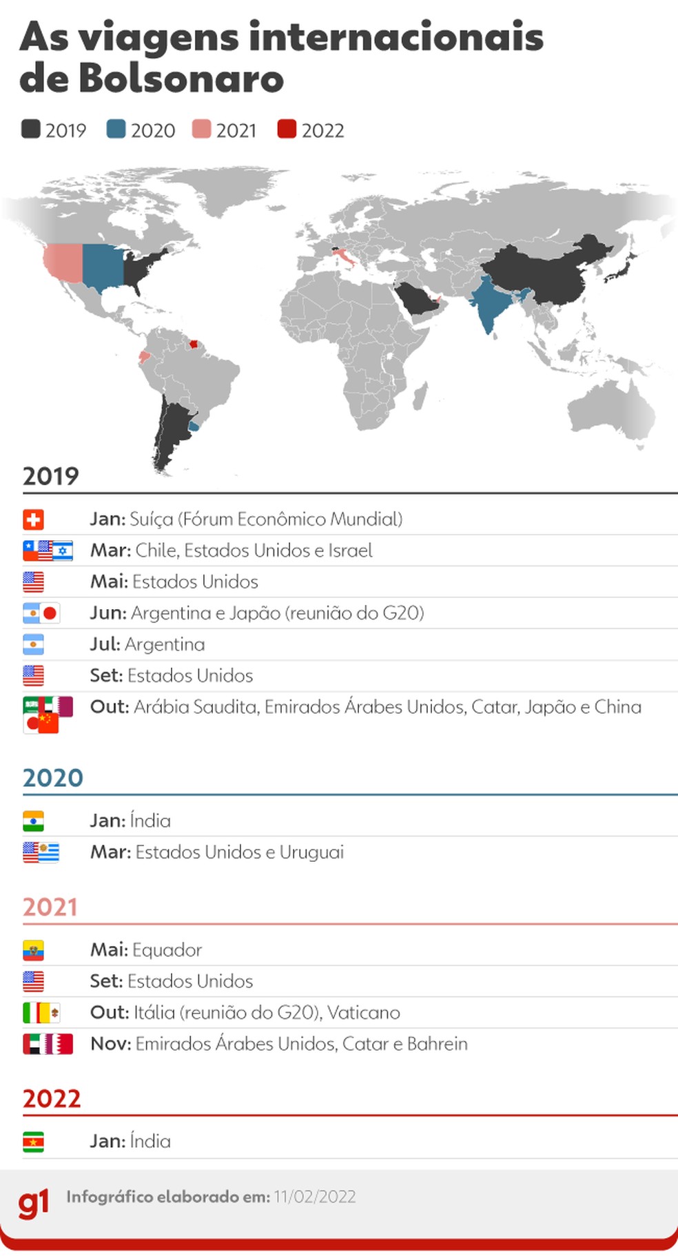 Em três anos de mandato, Bolsonaro não esteve em dois continentes — África e da Oceania. Com a viagem à Rússia, o presidente só não terá ido — dentre os parceiros do Brics, bloco de economias emergentes — à África do Sul. Ele já esteve na China e na Índia.