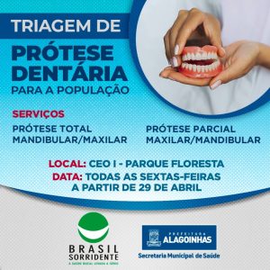 Visando ampliar o acesso às ações de Reabilitação em Saúde Bucal, a Secretaria de Saúde de Alagoinhas, por meio da Política Nacional de Saúde Bucal – Brasil Sorridente, promove pela primeira vez, a partir desta sexta-feira (29), triagens para obtenção de prótese dentaria. O serviço estará disponível no CEO I – Parque Floresta, todas as sextas-feiras das 07h30 às 12h.