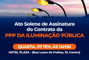 Na próxima quarta-feira, 07 de fevereiro, o prefeito Joaquim Neto fará a assinatura do contrato da PPP de Iluminação Pública de Alagoinhas, projeto de gestão, ampliação, modernização, operação e manutenção do parque de iluminação pública do município. O ato solene acontecerá às 14h30, no Hotel Plaza.